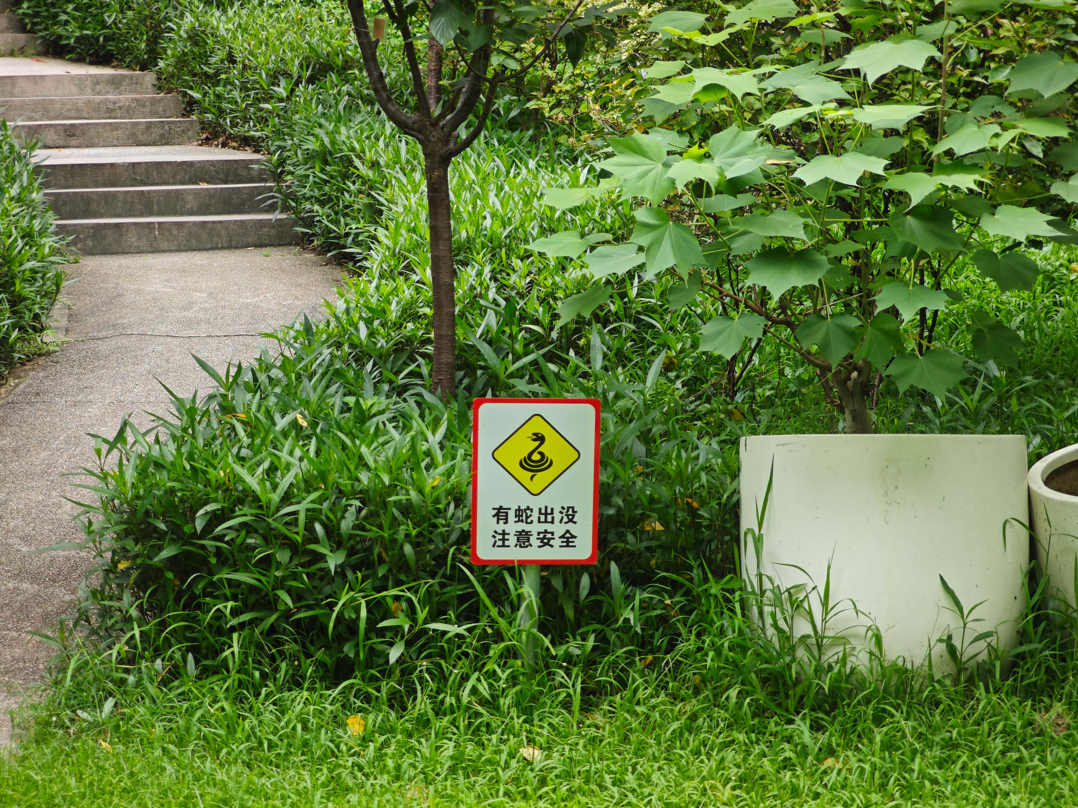 “请各位游客看管好小孩,尽量不要进入花草茂盛区域,以防被蛇咬伤……”25日中午,记者在白云永泰乒乓体育公园入口处看到,一块醒目的警示牌提醒游客防范“蛇出没”的注意事项。