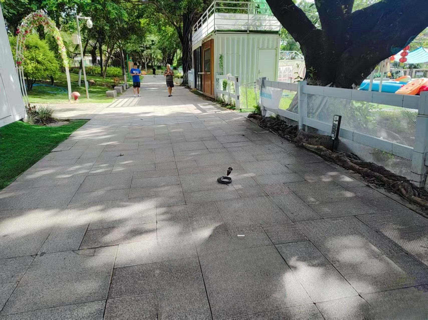 绿管中心管理人员姜敏介绍,永泰乒乓体育公园位于白云山麓,山体植被多,还有景观水池等湿地,松鼠、鸟类和蛇类都屡见不鲜。针对夏季“蛇出没”相对多发,他们在公园入口处竖立“蛇出没”紧急提醒1处,在园区主要道路、蛇类常出没区域设置“有蛇出没,注意安全”警示牌5处。并利用公园广播、LED显示屏等循环播放毒蛇咬伤预防知识。同时,工作人员在早晚游客高峰时段、蛇类活动活跃的午后至傍晚时段,加强绿化带、草丛、竹林、偏僻小径等区域巡查,文明劝导游客不要进入绿化带或草丛内玩耍,让市民游客提高防范意识,尽量避免有意无意“踩雷”。
