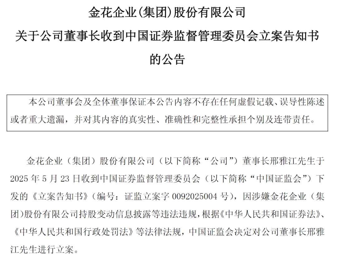 5月23日晚,金花股份(600080)公告称,公司董事长邢雅江于2025年5月23日收到中国证监会下发的《立案告知书》,因涉嫌金花股份持股变动信息披露等违法违规,中国证监会决定对邢雅江进行立案。