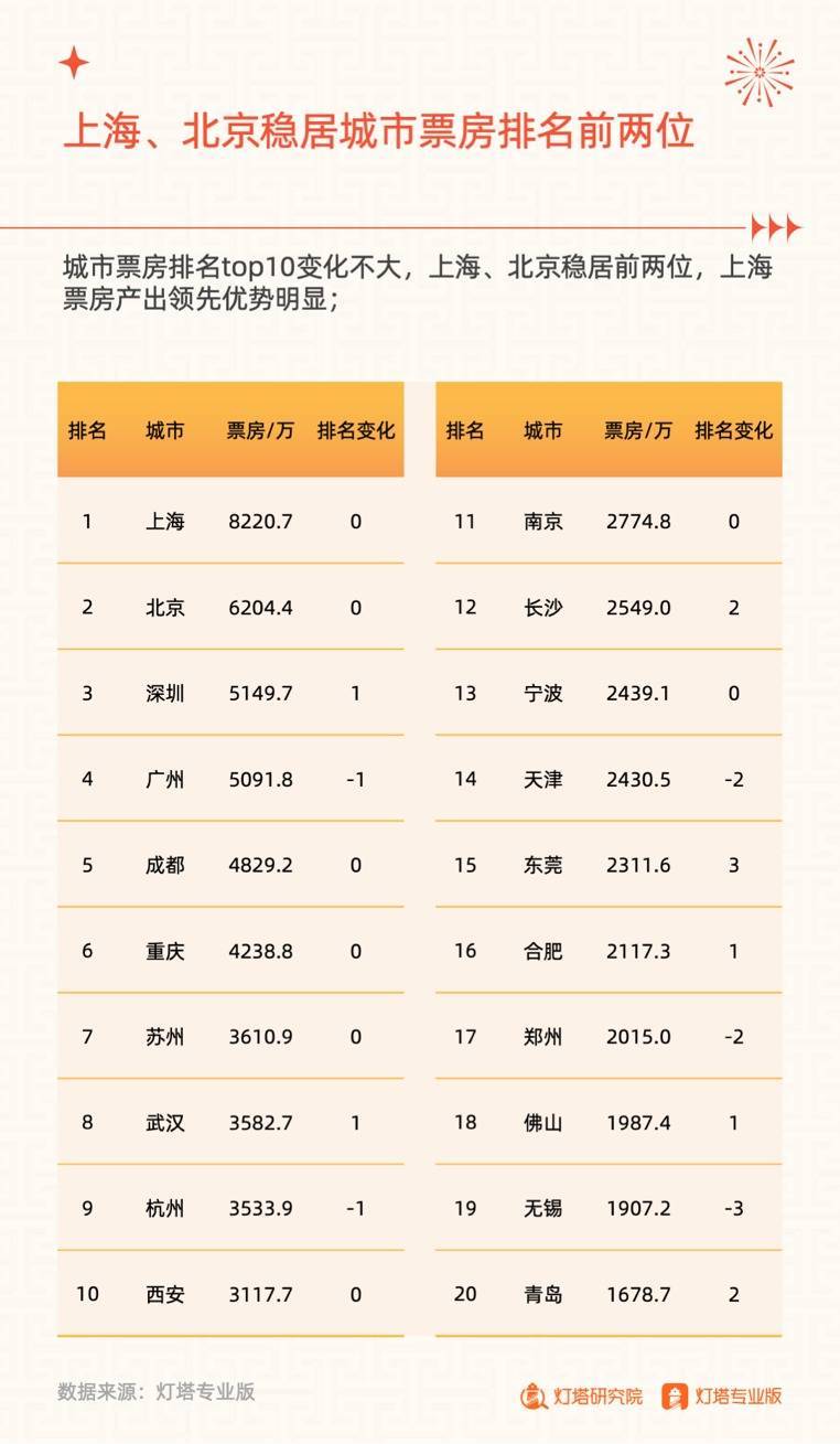 城市票房排名中,上海、北京稳居前两位,上海领先优势明显。全国10家影城票房破百万,武商梦时代摩尔影城(IMAX激光店)票房产出居首。