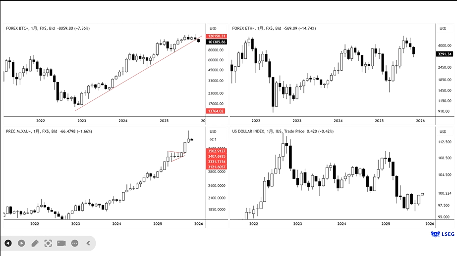 近期市场分析中加强了对技术面(TA)的关注,技术分析如同金融市场的基础教育,是交易策略的“数学基础”,更高层级的分析需结合宏观经济学、政治经济学、跨市场联动、流动性及衍生品等维度,形成自上而下的逻辑框架。但在具体交易中,入场点、出场点与策略设计仍依赖技术分析这一基础工具。因此在关键时间点(如月度收盘),对K线形态的研判尤为重要。 例如,11月3日月度收盘后,我们通过观察比特币、黄金等资产的收敛三角形形态、十字星与射击之星等关键信号,预判市场脆弱性上升。这些微观信号与宏观层面的估值、流动性风险形成重要的分析因素,可以预判当前的市场转向。