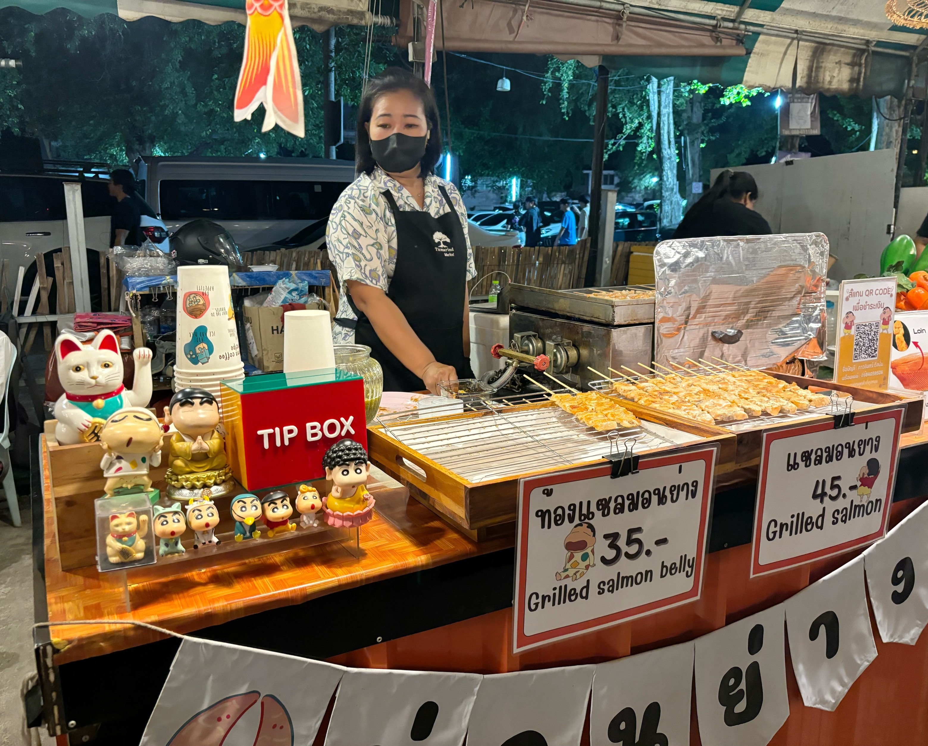 为招揽顾客,华欣夜市烧烤摊上也摆着潮玩。 南方+记者 李劼 拍摄
