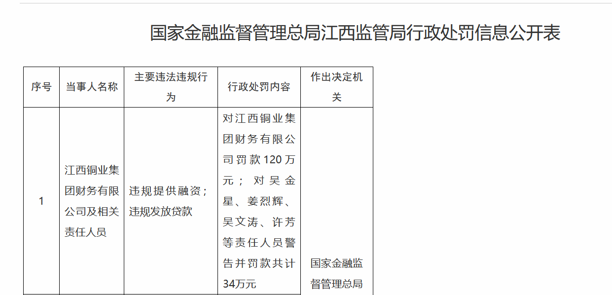 5月23日,据国家金融监督管理总局江西监管局行政处罚信息公开表显示,江西铜业集团财务有限公司因违规提供融资、违规发放贷款被罚款120万元。同时,吴金星、姜烈辉、吴文涛、许芳因违规提供融资、违规发放贷款,被警告并罚款共计34万元。